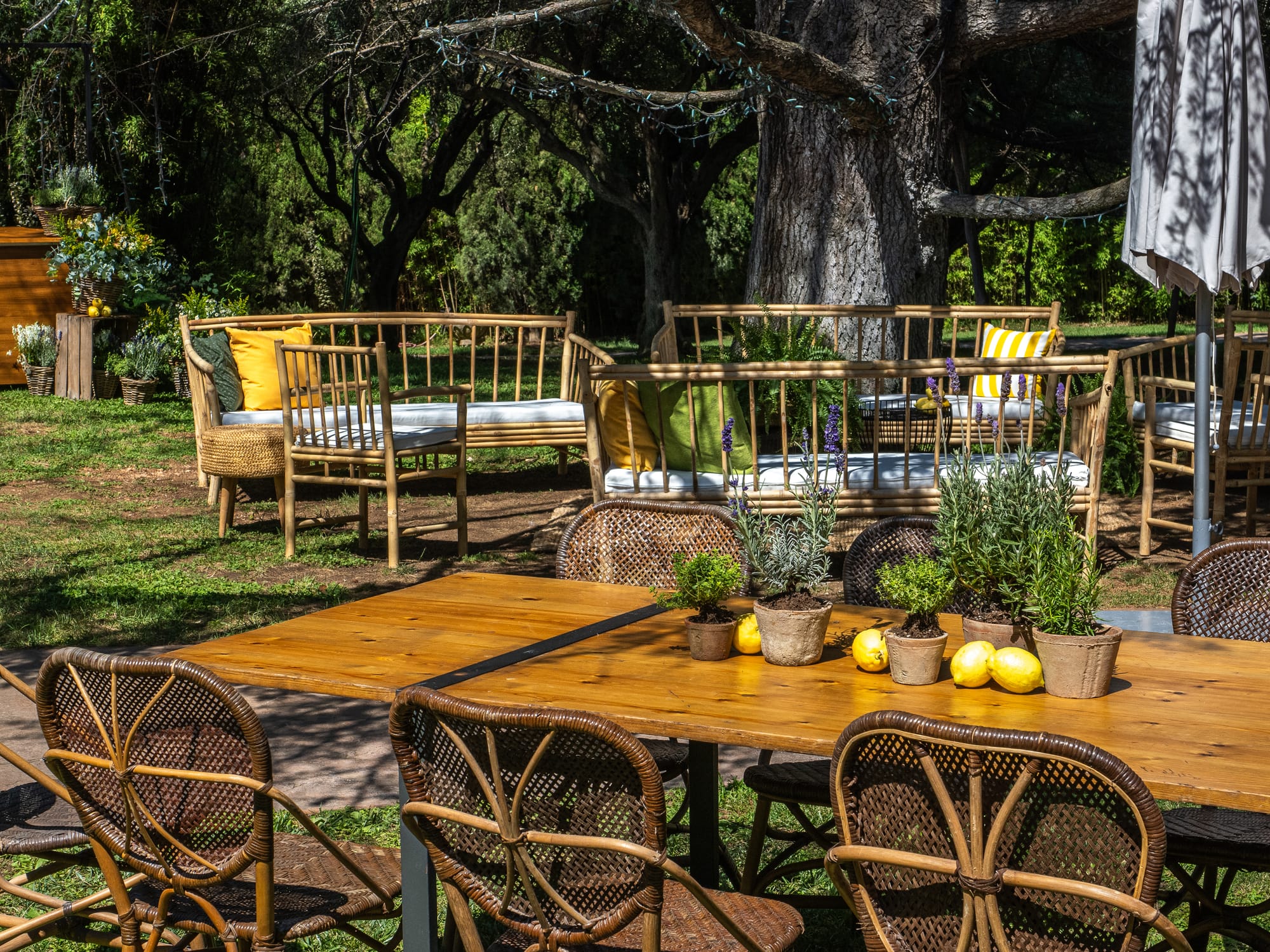 Utiliza muebles de fibras naturales como ratán o mimbre. Puedes conseguirlos fácilmente mediante el alquiler de mobiliario, lo que además te da libertad para jugar con diferentes estilos sin comprometer tu bolsillo. Añade cojines coloridos, sombrillas decorativas y detalles en bambú. Las mesas largas con manteles tropicales serán el punto focal.