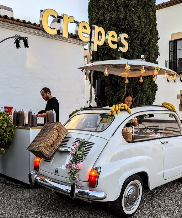 Si quieres sorprender a tus invitados con una propuesta única, 600 Crepes lleva a tu evento un encantador food truck instalado en un clásico Seat 600, creando un rincón tan original como delicioso. Su concepto combina estética vintage y gastronomía en directo para convertir la recena o el postre en uno de los momentos más especiales de la celebración.